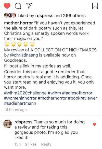 8 May 2020: It was wonderful reading my poems from A COLLECTION OF DREAMSCAPES in Part II of The Outer Dark Quarantine Reading series, hosted by the fabulous Anya Martin, alongside my wonderful friend Mike Allen who read excerpts from his new books AFTERMATH OF AN INDUSTRIAL ACCIDENT and A SINISTER QUARTET! The episode also features Gordon B. White's review of Mike Griffin's novella ARMAGEDDON HOUSE. 5 May 2020: Elated to see this fantastic review Closing out National Poetry Month with Horror Poetry by Readers' Advisor Becky Spratford and my interview with poetry legend Linda Addison! "A COLLECTION OF DREAMSCAPES by Christina Sng is a poetry collection every public library should own." --Becky Spratford, Readers' Advisor, MLIS 5 May 2020: Overjoyed to see this 5 star National Poetry Month review of A COLLECTION OF NIGHTMARES! "The poetry is lovely -- written in a variety of styles, and covering a variety of horror-related topics -- these two things combined keeps every page feeling fresh and fascinating. This is a great read by a massively talented poet." --Angie at Mediadrome 2 May 2020: My haiku "lockdown week one" has been selected as one of Haiku University's Weekly Best from 13-20 April 2020!