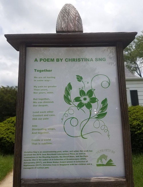 within sight seeing stars still can't decide 5 June 2020: It was absolutely lovely to be interviewed by the wonderful Stephanie M. Wytovich whose work so greatly inspires. Catch Into the Dreamscape: An Interview with Christina Sng at her Madhouse today! 26 May 2020: This fantastic review of A COLLECTION OF DREAMSCAPES absolutely made my day: A COLLECTION OF DREAMSCAPES IS A THING OF BEAUTY AND POWER THAT'S AVAILABLE NOW FROM RAW DOG SCREAMING PRESS! "Hot off the Raw Dog Screaming Press, this collection is going to turn what we learned as children upside down by empowering those who've been victims in fairy tales and mythology. By fixing our near gospel stories into positive tales, Sng is opening a new chapter in a brand-new world." --Damaged Skull Writer 25 May 2020: Thank you, Sadie Colleen Hartmann, for being a tireless champion of women in horror, and for your incredible scholarship and writing. Thank you for this wonderful list of Women in Horror! I am truly honoured to be a part of it alongside my many friends and colleagues whose work I admire so much. 24 May 2020: Overjoyed to see my poem "Together" featured in The Fox Poetry Box!